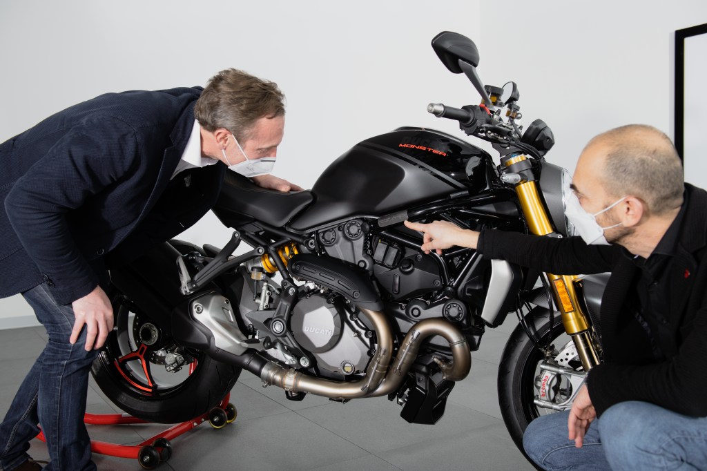 El modelo Monster en un momento importante de su historia con la entrega del modeleo número 350,000, una Monster 1200 S “Black on Black”, que el CEO de Ducati, Claudio Domenicali, y el director del Centro de Diseño de Ducati, Andrea Ferraresi, entregaron personalmente a su propietario, el Ducatista Sebastien Francois Yves Hervé De Rose.