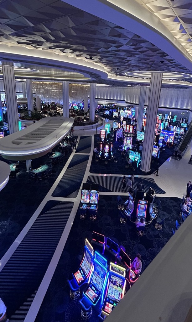 El casino, con más de 16,000 m² y techos de 13 metros de altura, es una joya por sí solo. Cuenta con 1,300 maquinitas y 128 mesas de juego. Tuvimos la oportunidad de pasar un día de alberca y sol en la Oasis Pool donde probamos bebidas deliciosas y refrescantes a un costado de la alberca. Recuerdo el sabor de un Shirley Temple bajo la sombra de una de las palmeras en un calor que superaba los 40 grados centígrados del clásico verano en Vegas.